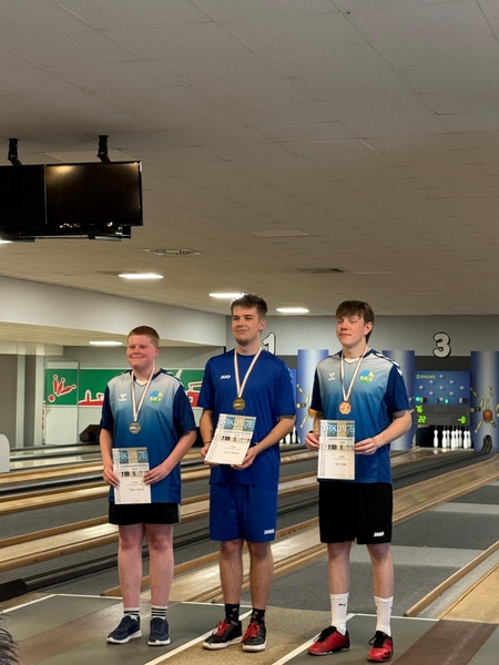 | Im dritten und letzten Durchgang antretend (bei insgesamt 15 Spielern), war sein Start auf Bahn 5 (Rechtsaufsatz) gar nicht so optimal. Aber gerade auf den Innenbahnen 2 bis 4 spielte er sein technisches Vermögen aus. Bis zehn Würfe vor Schluss lag er mit dem späteren Landesmeister Linus Reichert (Anklam, 868 Hölzer) gleichauf. Dann eine Unachtsamkeit. Eine „5“ und eine „6“ ließen den Traum vom Titel platzen. Mit 866 Hölzern (+26) bezwang er in einem wahren Krimi den haushohen Titelaspiranten Erik Fieber (MSC Waren) um drei Hölzer und schnappte ihm zudem die Fahrkarte zu den DJM weg, denn nur zwei Spieler sind für die Titelkämpfe am 05.Juni in Peine startberechtigt. Als zusätzliche Auszeichnung an seinem 15. Geburtstag wurde ihm vom Landesjugendwart des SKVMV das „Goldene Leistungsabzeichen Jugend“ überreicht. Zudem wurde er in den Landeskader M-V der AK U18 berufen, der ihm gute Chancen zur Teilnahme am Deutschlandpokal einräumt. | |