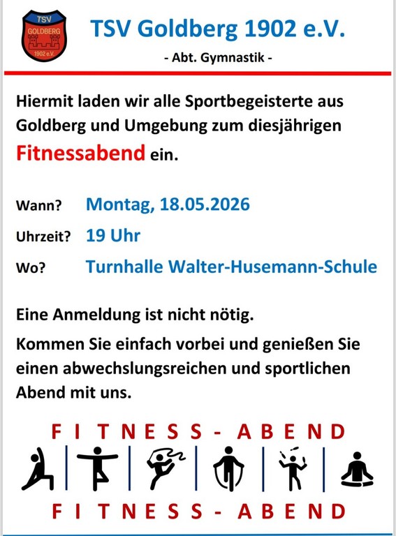 Einladung zum Fitnessabend 2026 der Abteilung Gymnastik des TSV Goldberg !„Egal, wie schlecht dir deine Fitness vorkommt – du schlägst immer noch jeden, der auf dem Sofa geblieben ist !“ Unter diesem Motto lädt die Abteilung Gymnastik des TSV Goldberg 1902 e.V. auch in diesem Jahr wieder alle Sportbegeisterte aus Goldberg und Umgebung zum diesjährigen Fitnessabend ein. Dieser findet am 18.05. 2026 um 19:00 Uhr in der Mehrzweckhalle an der Regionalschule Walter Husemann statt ! Kommen Sie einfach vorbei und genießen Sie einen abwechslungsreichen und sportlichen Abend mit uns gemeinsam. Eine Anmeldung für dieses sportliche Event ist nicht notwendig. Michael Haase |