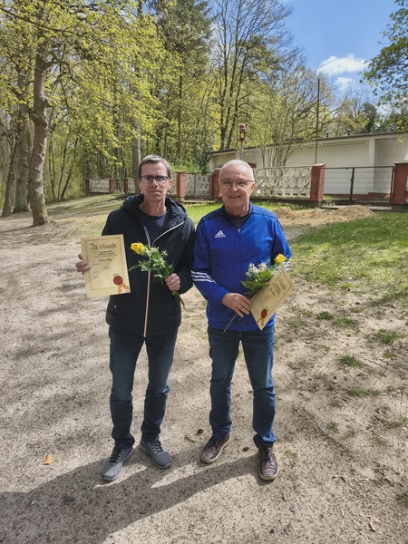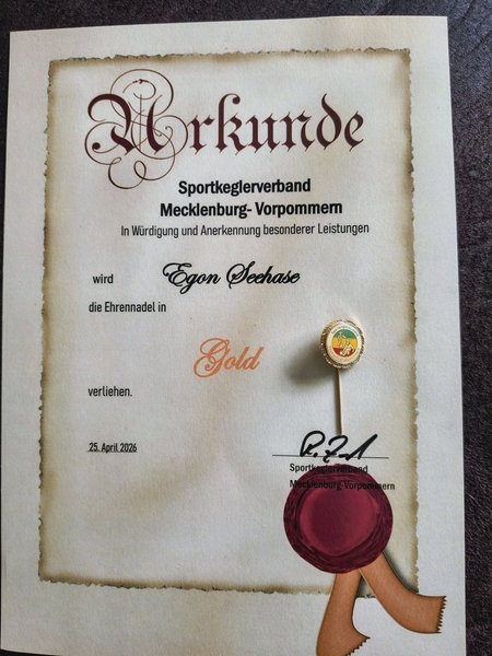 des Sportkeglerverbandes Mecklenburg-Vorpommern statt. Beiden wurde eine besondere Ehre zuteil. Für ihr langjähriges Engagement und ihre besondere Einsatzbereitschaft für den Kegelsport wurden beide vom Vizepräsidenten des SKVMV, Sportfreund Rocco Zech aus Bergen, mit der Ehrennadel des SKVMV in Gold (Egon) bzw. Silber (Nando), einer Urkunde und einem Blumenstrauß ausgezeichnet. Egon ist bei den Goldberger Keglern seit dem Jahr 1995 aktiv. Zunächst bis 2013 als Mannschaftskapitän der zweiten Männermannschaft und bis 2017 Mitglied der Seniorenmannschaft übernahm er 2006 das Amt des Abteilungsleiters von Wolfgang Weidemann. |